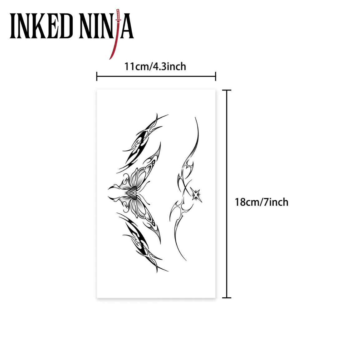 This design is a bold revival of Y2K tribal tattoos with a feminine twist. The upper flame-styled arc anchors the look with raw edge, while the lower butterfly-heart fusion spreads with ornamental grace. It’s crafted specifically as a tramp stamp - perfect for the female lower back - with wings and curves that follow the natural lines of the waist.