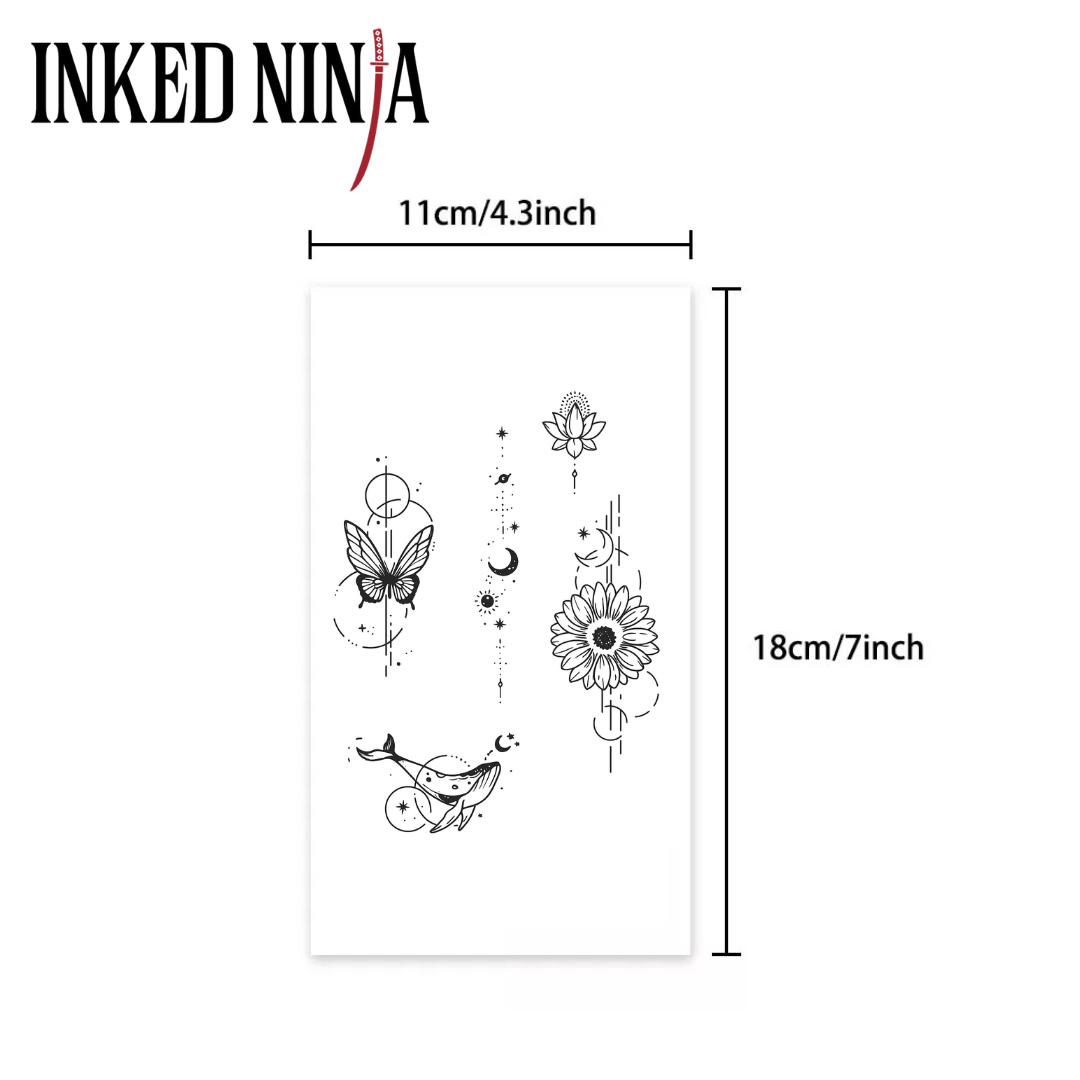 Butterflies, whales, lotuses, and sunflowers all orbit within stars, moons, and planetary lines. Each design feels like it’s floating in space, balanced between nature and something larger. These work beautifully on the upper arm, side rib, or thigh. Place the vertical ones down the spine or forearm. The whale makes a soft lower back piece or a standout on the shoulder blade.